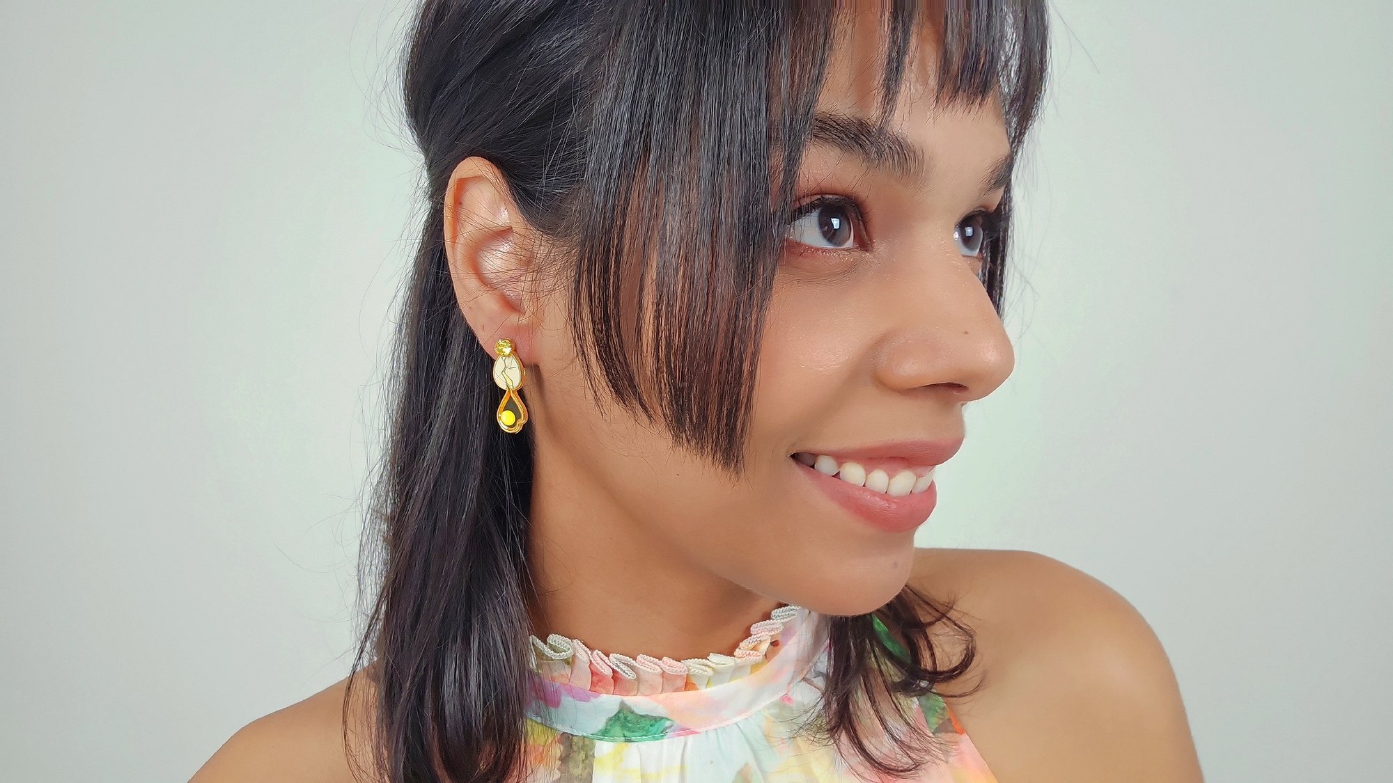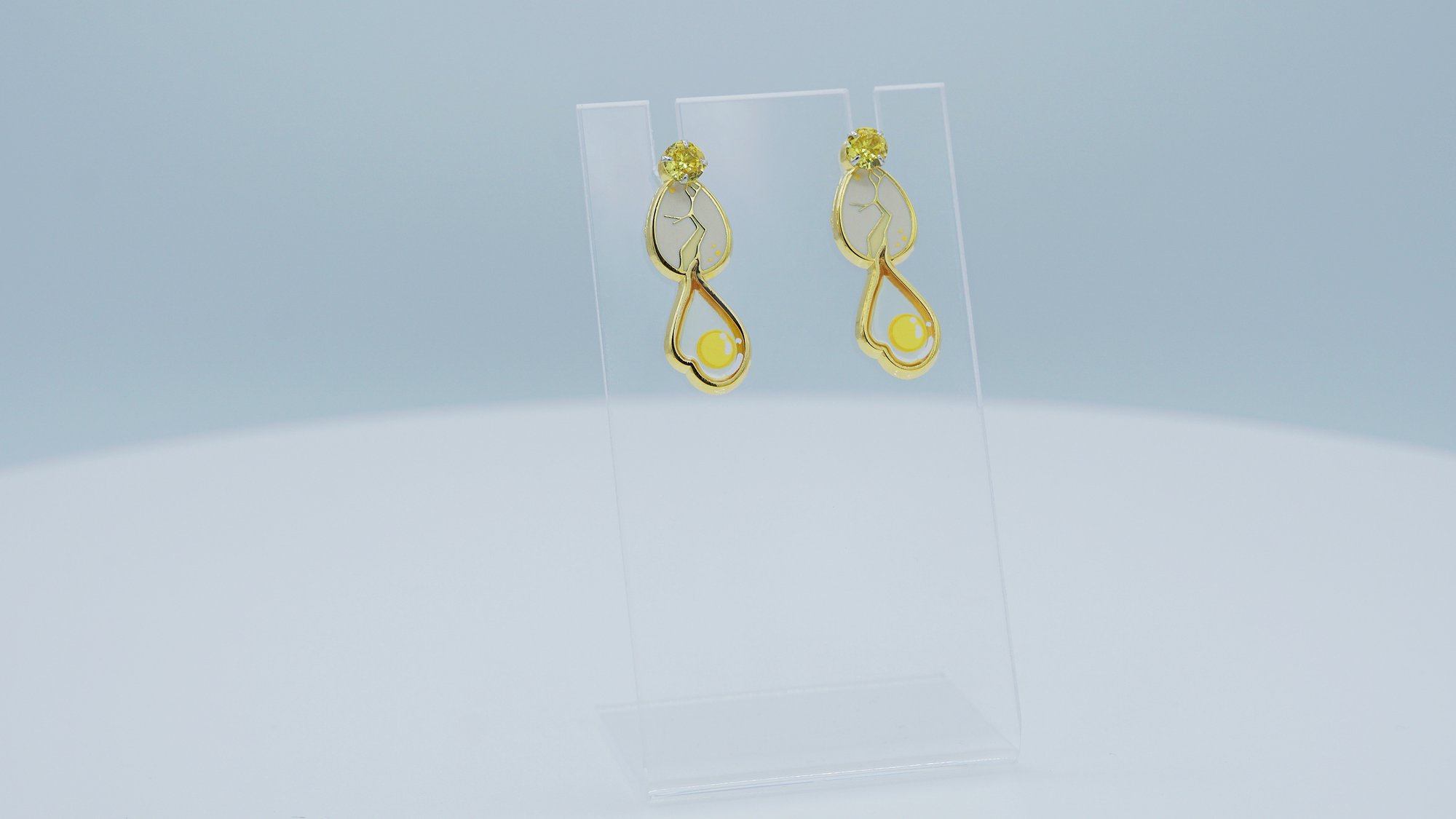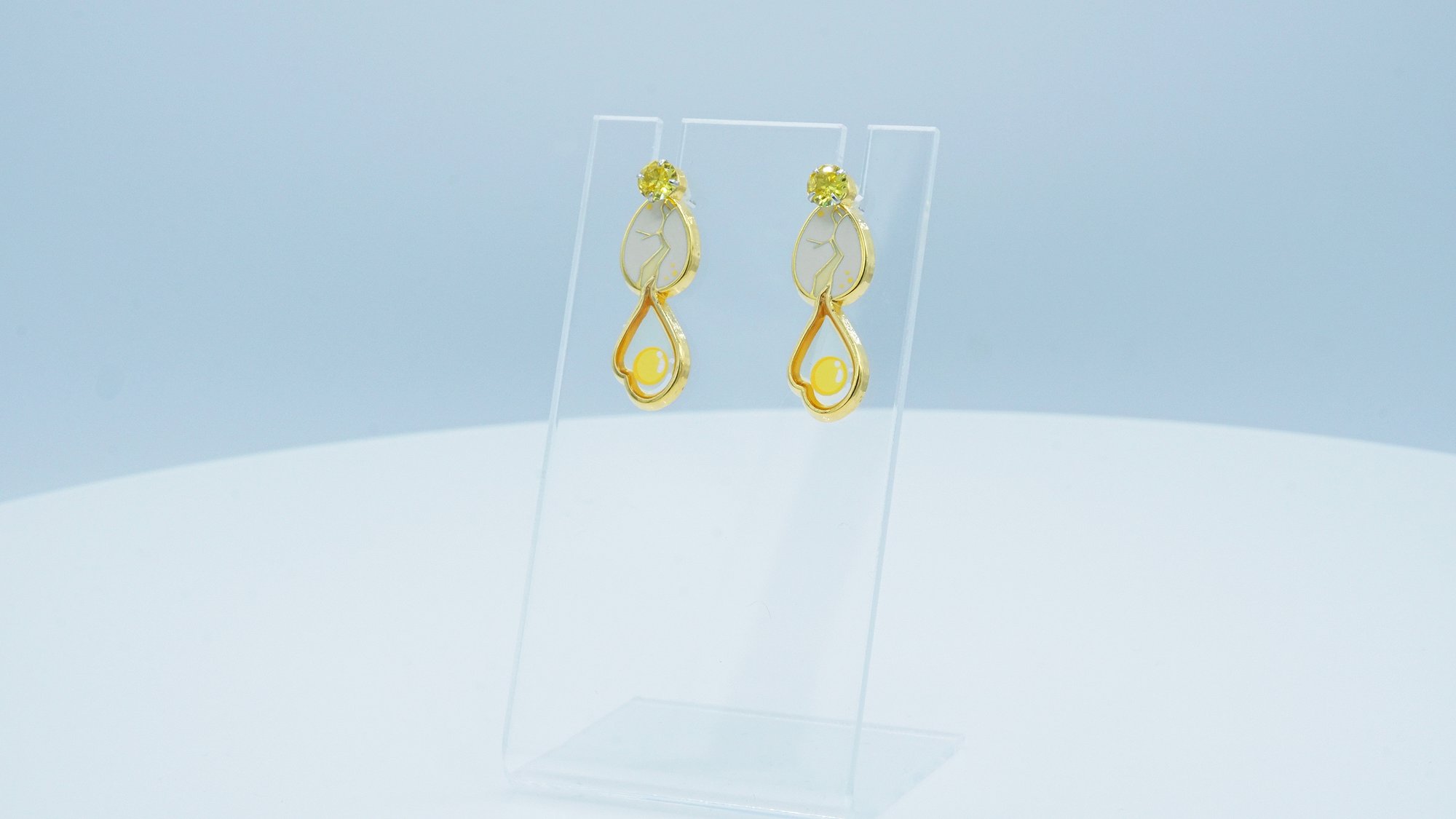 Featuring 14k gold plating on surgical steel earring studs, the egg-shaped earrings have a cracking shell with a cute egg white design dripping down the center. Each pair is light weight and the details are screen printed on. The delicate look of these earrings make them perfect for everyday wear or an evening out.