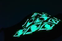The glowing eye mask is designed to be somewhat neutral in the day but bright and vibrant at night. The reflective vinyl shines brightly in low light situations and has a matt grey look in bright light. The neon green glow is vibrant in the day and even more amazing once it has been charged in the sun or light.