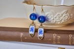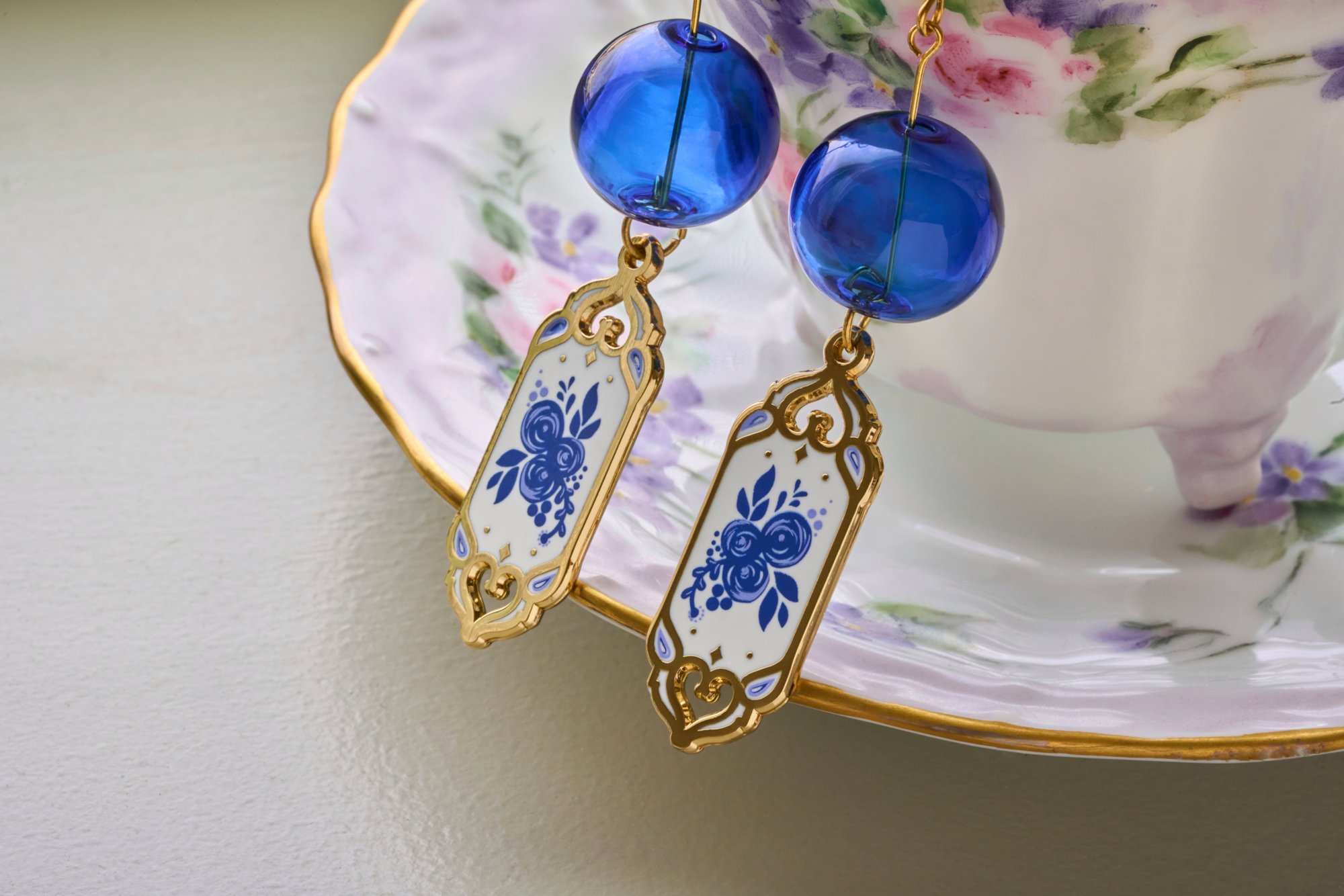 Each pair features a deep sapphire glass orb that catches the light like a summer breeze drifting through a quiet garden. Suspended beneath it, the enamel pendant is framed in rich 18K gold plating and decorated with intricate floral motifs reminiscent of classic porcelain heirlooms.