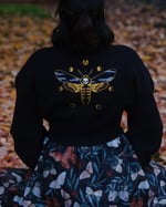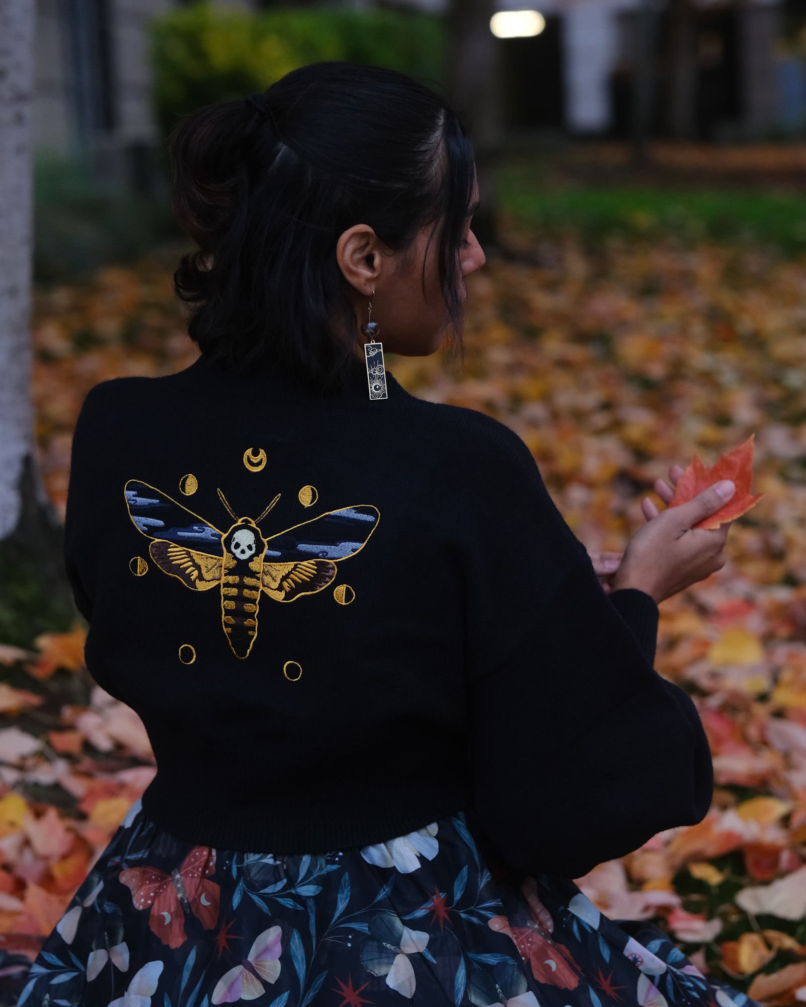 Many say this moth can symbolize a passing to the afterlife, but it can also symbolize letting something go in order to move on. The moth flies into the night holding clouds in its wings. It is surrounded by the ever-changing moon phases and at the top, the Sekai Art Shinjidai (New Era) moon. This moon represents taking something from a previous era and transforming it into a new version of itself.